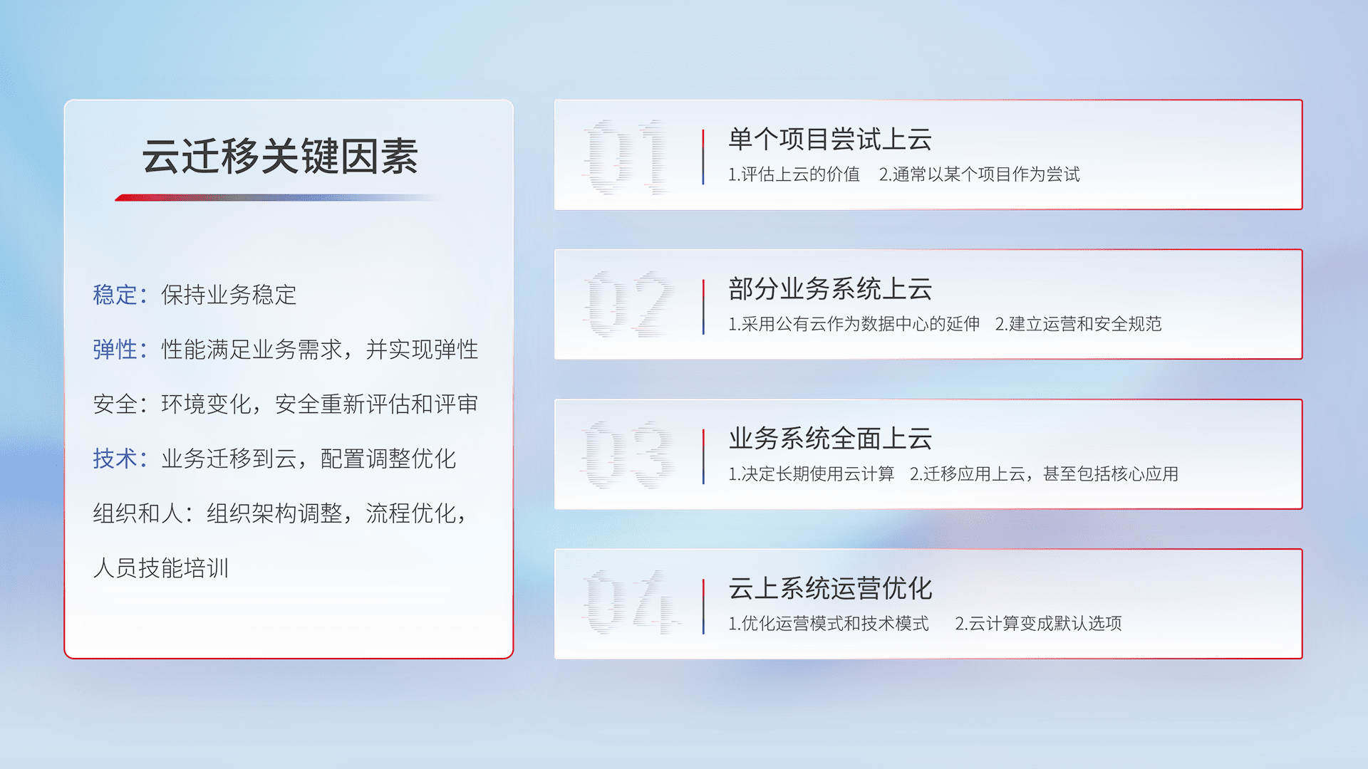 结合实际业务,,从规划设计、、、云平台选型、、、云原生改造、、、、数据迁移、、、集成交付,,,迁移全过程为客户识别最佳上云路径,,,做好风险识别管理,,,设计网络架构、、、、身份权限、、安全审计合规、、操作审计、、日志审计、、、、监控告警策略、、、多站点容灾设计等,,,,对云上基础设施进行整体规划,,,,提升IT治理水平,,,,以满足弹性、、高可用、、高性能的需求。。
